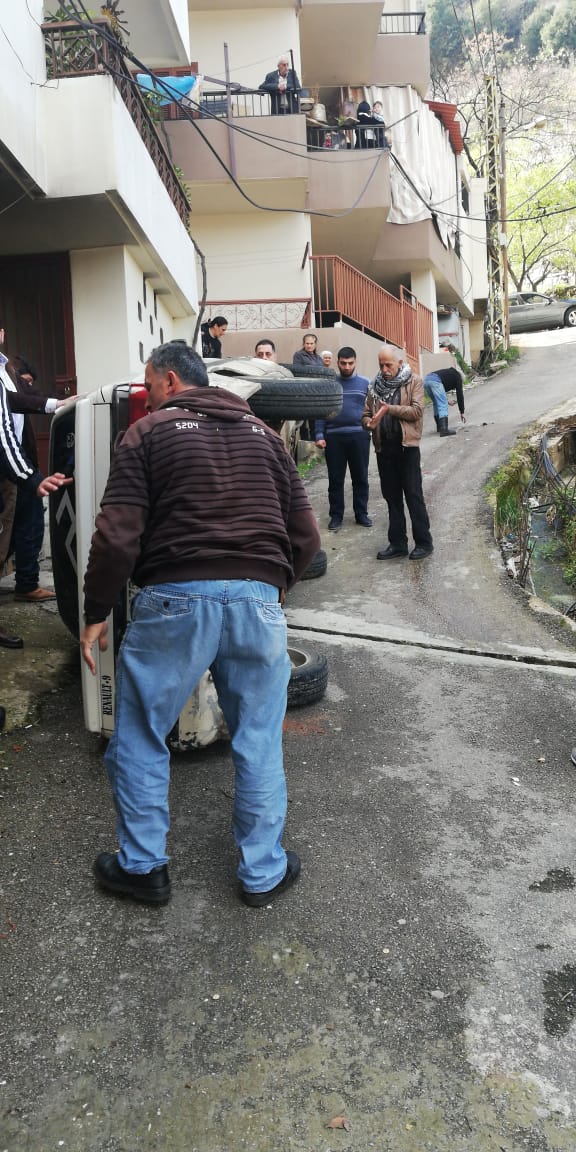 انقلاب سيارة في منطقة حقل العزيمة-الضنية واقتصرت الاضرار على الماديات