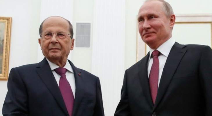 افادت معلومات لصحيفة “الأخبار” بأن “الرئيسين الروسي فلاديمير بوتين واللبناني ميشال عون عرضا خطوط تفاهم عامّة حيال مختلف الملفّات المشتركة، بدءاً من ملفات النفط والغاز والتعاون العسكري والمالي والتبادل التجاري والاقتصادي، وصولاً إلى التعاون في الملفات الدبلوماسية على المستوى الدولي ومآلات الأزمة السورية وانعكاساتها على لبنان، ولا سيّما مسألة النازحين”.
