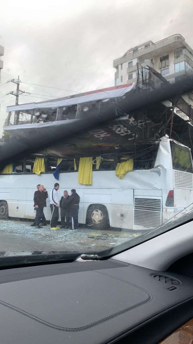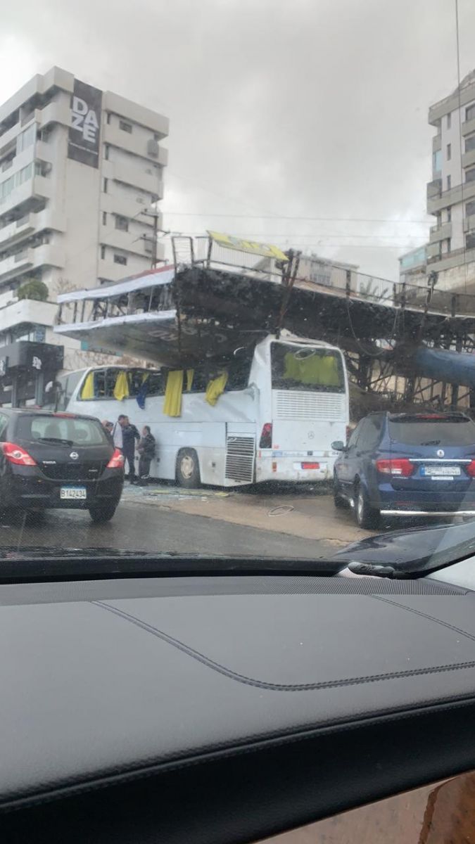 سقطت لوحة إعلانات على باص متوقف على جانب الطريق في المسلك الشرقي من أوتوستراد جونية، وذلك بسبب قوة الرياح. وقد اقتصرت الأضرار على الماديات.