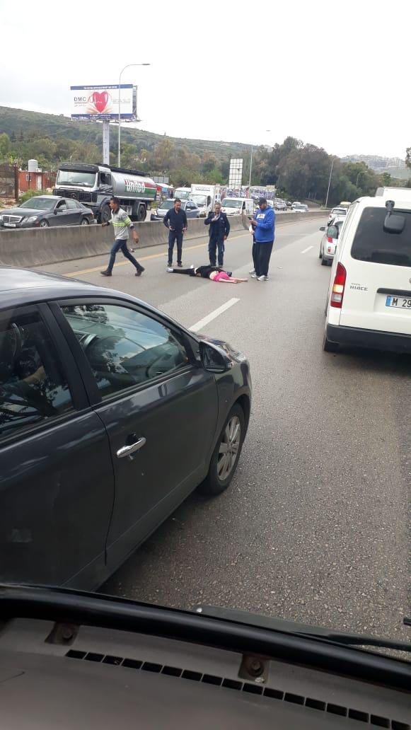 بالصورة جريحة نتيجة حادث صدم ووضعها حرج للغاية على المسلك الغربي لأوتوستراد الدامور السعديات محلة مفرق الجبل ويشهد المسلكين للأوتوستراد حركة مرور كثيفة