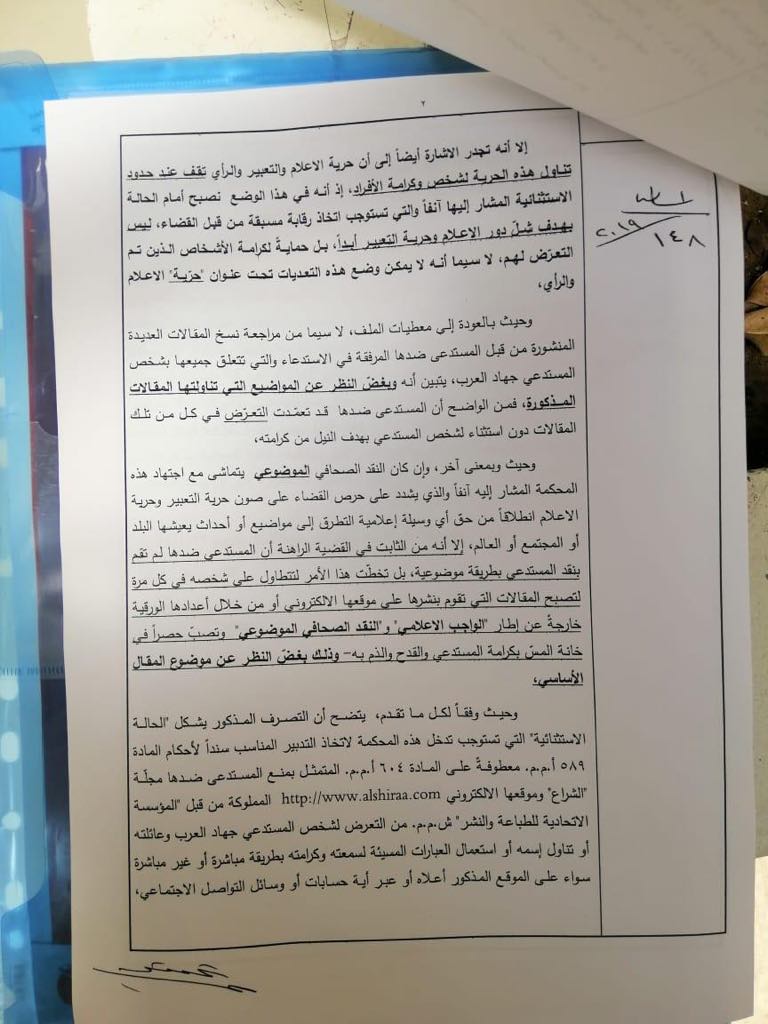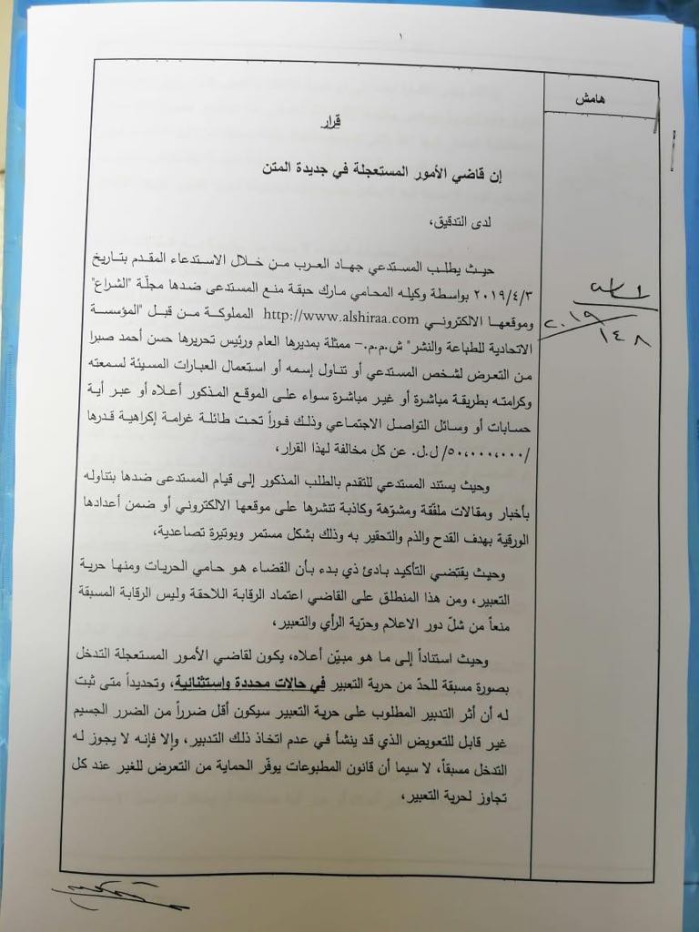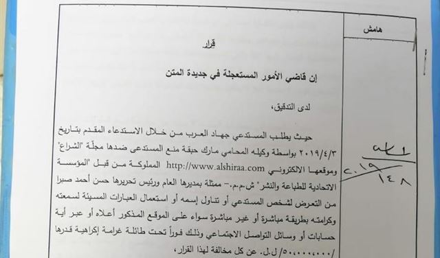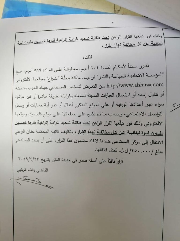 وكلف القاضي كركبي كاتبة المحكمة حنان الراعي الإنتقال الى مركز المستدعى ضدها لإنفاذ مضمون هذا القرار على أن يسدد المستدعي مبلغ 250000 ل.ل كبدل انتقالها.ويأتي القرار بعد طلب المستدعي جهاد العرب من خلال الإستدعاء المقدم بتاريخ 3/4/2019 بواسطة وكيله المحامي مارك حبقة منع المستدعي ضدها مجلة “الشراع” وموقعها الإلكتروني http://www.alshiraa.com المملوكة من قبل “المؤسسة الإتحادية للطباعة والنشر ش.م.م” ممثلة بمديرها العام ورئيس تحريرها حسن صبرا من التعرض لشخص المستدعي أو تناول اسمه أو استعمال العبارات المسيئة لسمعته وكرامته بطريقة مباشرة أو غير مباشرة سواء عبر أعدادها الورقية أو الموقع المذكور أو عبر أية حسابات أو وسائل التواصل الإجتماعي، وبسحب ما تم نشره على صفحتها على موقع فايسبوك وموقعها الإلكتروني وذلك فور تبلغها القرار الراهن تحت طائلة تسديد غرامة إكراهية قدرها خمسين مليون ليرة لبنانية عن كل مخالفة لهذا القرار
