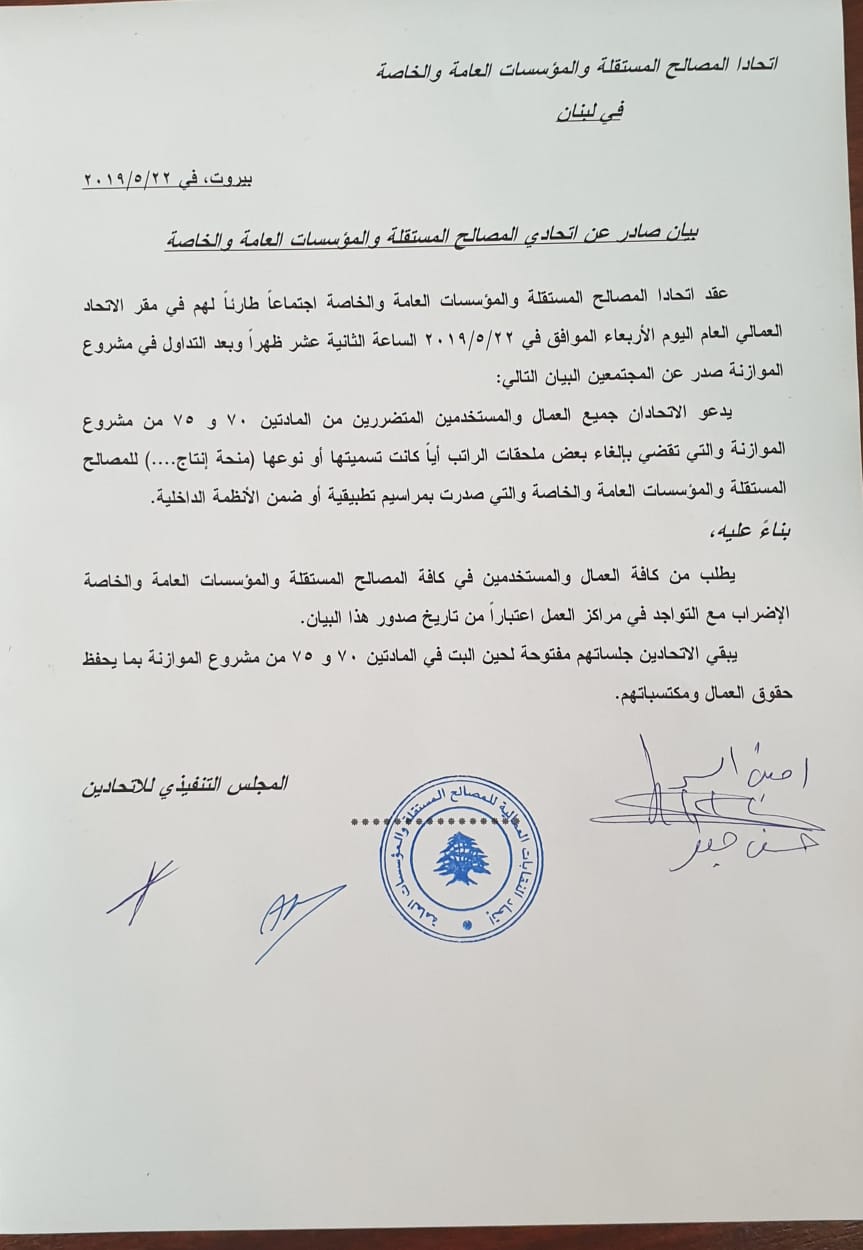اتحاد العمال العام يعلن الإضراب العام في كافة المصالح الخاصه والعامه وذلك لعدم المساس في رواتب الموظفين. ويكون الإضراب بالتواجد في مركز العمل