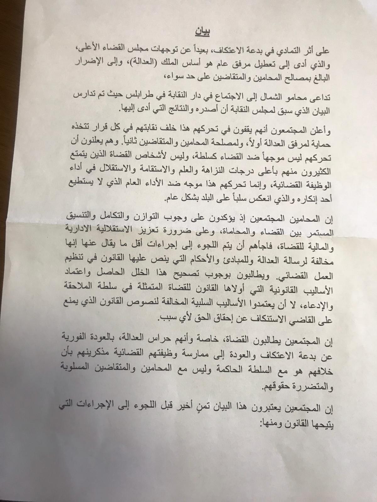 ورغم تأكيد المحامين على ضرورة الاستقلال القضائي الإداري والمالي، الا انهم أصدروا بياناً هددوا بموجبهِ بقيامهم باتخاذ سلسلة إجراءات، تبدأ بتوجيه إنذارات الى القضاة المعتكفين والى مداعاة الدولة عن ممارسات هؤلاء.