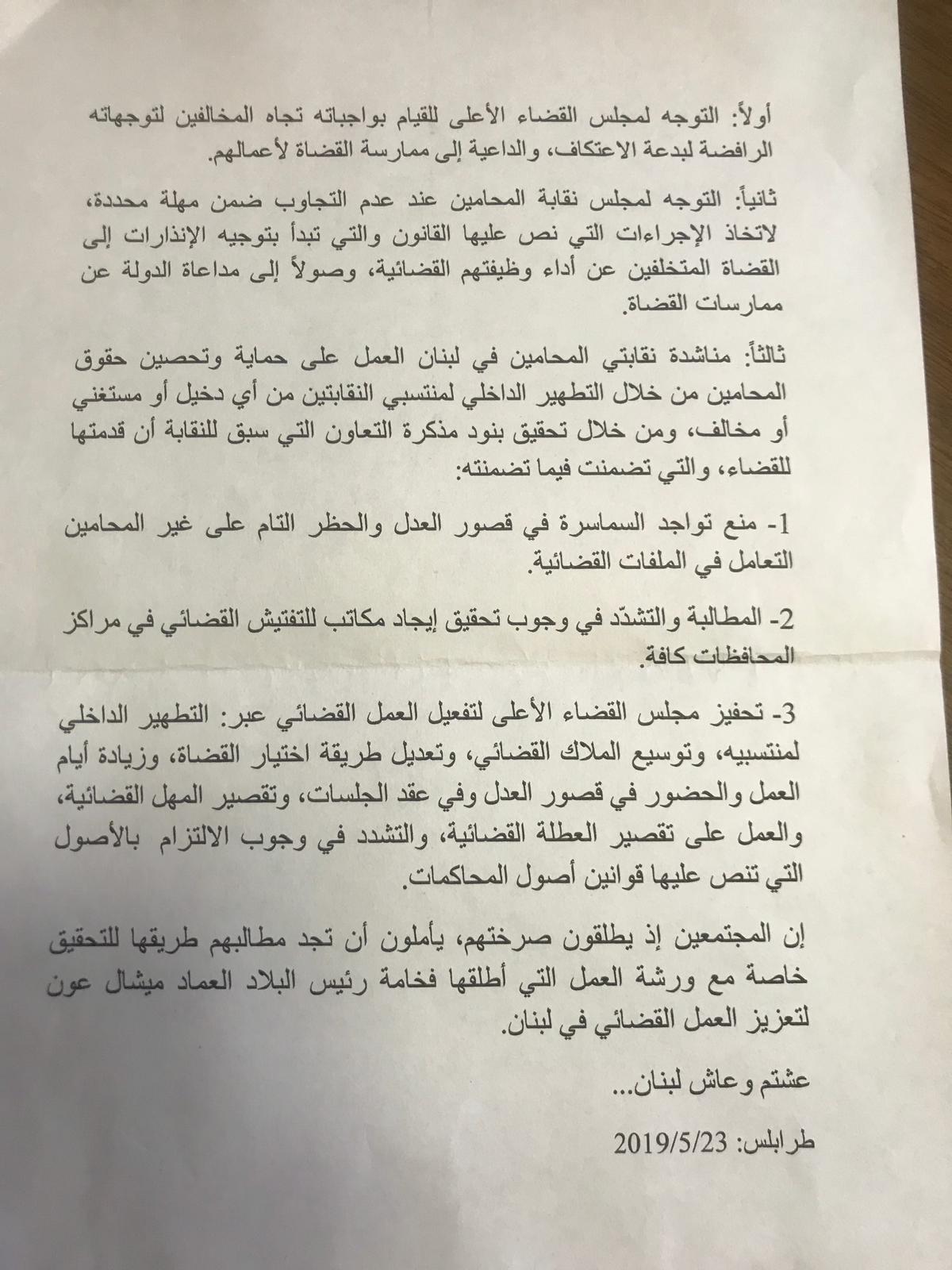 ولم يتوقف المحامين عند هذا الحد، بل أثروا الى اسداء نصائح تتعلق بقصور العدل وبالسلطة القضائية، فضلا عن رسم خارطة طريق لمجلس القضاء الأعلى، لإجراء التطهير الداخلي وتعديل طريقة اختيار القضاة، وأمورٍ عدّة منها، زيادة الحضور الى قصور العدل والالتزام بالإجراءات التي تنص عليها قوانين أصول المحاكمات.