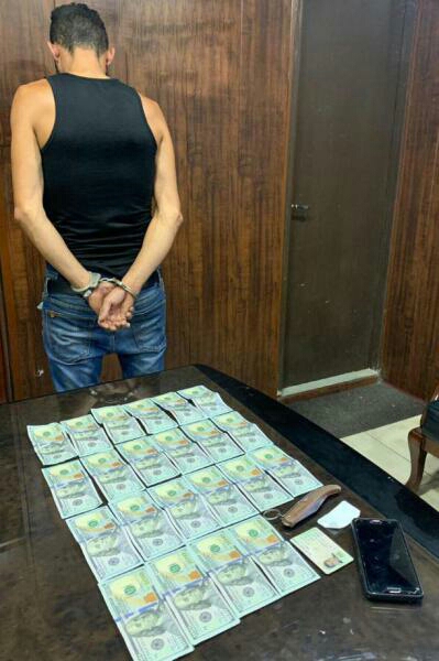 بتفتيشه ضبط بحوزته 2200$ سمن فئة الماية دولار جميعها مزيف، و 3 أوراق لف سجائر. وقد تبين أنه يتواصل مع عدد من المشتبه بهم بجرم تجارة وترويج المخدرات.
