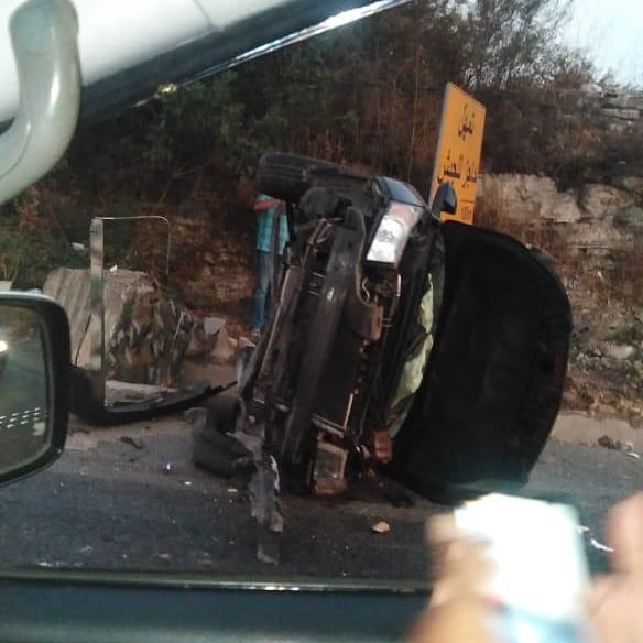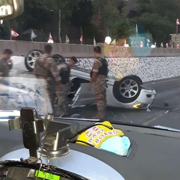 بالصور حادث سير مروع على حاجز المدفون مركبتين تجتاحان الحاجز بسرعة هائلة ومن ثم إنقلبتا على مسربي الحاجز والسير شبه متوقف باتجاه بيروت