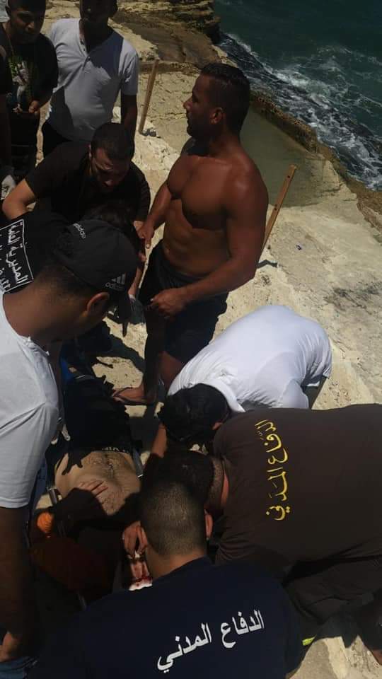 كما حضرت عناصر الدفاع المدني فوراً إلى الشاطئ، لنقل الشاب الذي أصيب بكسور بالغة في كافة انحاء جسمه نتيجة الارتطام بالصخور، وذلك إلى مستشفى الجامعة الأميركية.