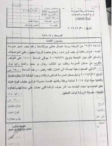 حصل “لبنان 24” على محضر موقّع في تاريخ الإثنين 30/9/2019 من قبل وحدة شرطة بيروت يفيد بمحاولة خطف. وكشف المحضر أن اتصالا هاتفيا ورد من زاهد حيدر مدير مدرسة “الليسيه” فردان، مفاده أن “جيب” لون أسود حاجب للرؤية مجهول باقي المواصفات أقدم سائقه نهار الجمعة الفائت، على التوقف بالقرب من مدخل المدرسة وطلب من أحد الطلاب الصعود بغية ايصاله الى المنزل لكنه رفض.. واشار المحضر الى أن الحادث تكرر مع طالبة أخرى كانت برفقة والدتها حين اقدمت متسولة على محاولة خطفها.