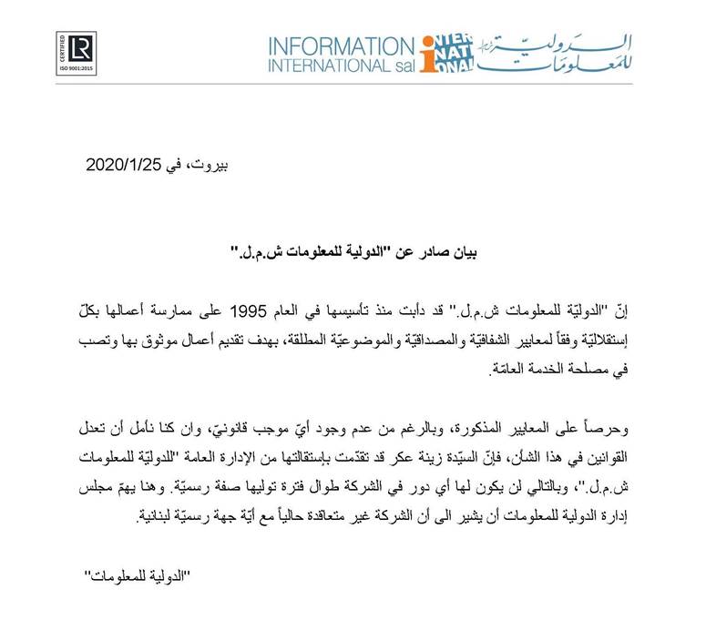 وأوضحت إدارة “الدولية للمعلومات” أنّ الشركة غير متعاقدة حاليا مع أي جهة رسمية لبنانية.