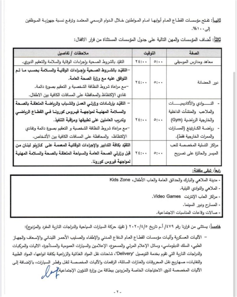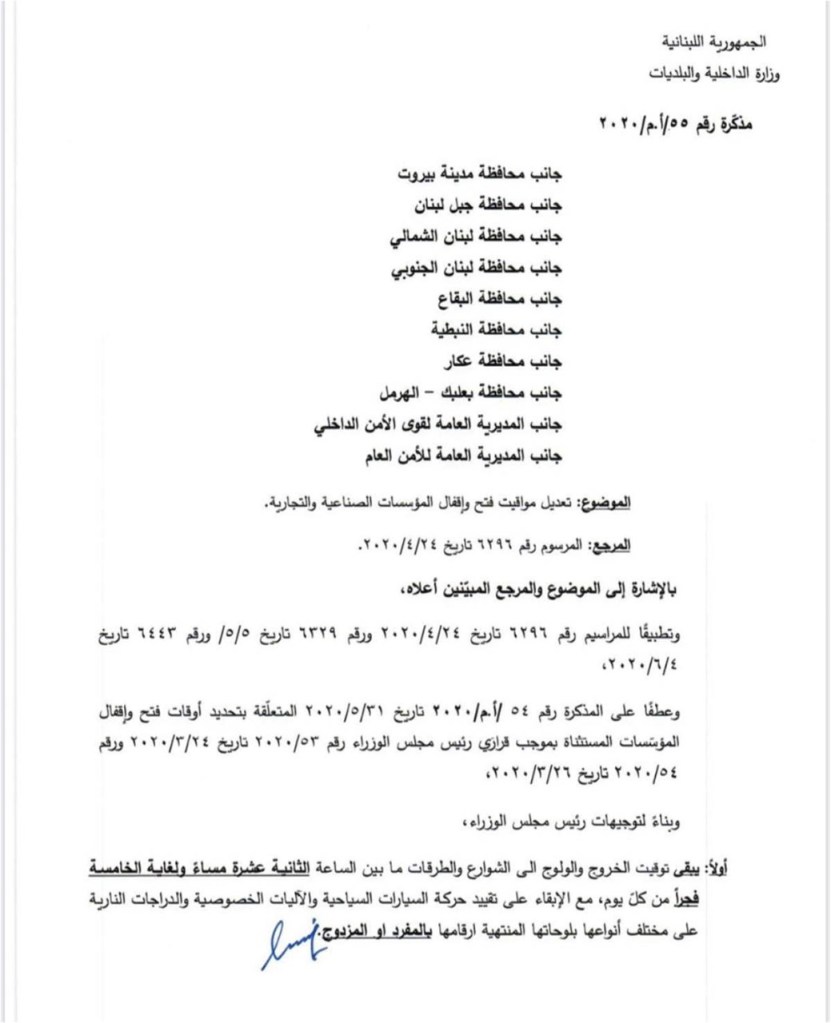 أعلن وزير الداخلية والبلديات العميد محمد فهمي، تعميمًا جديدًا حول مواعيد فتح المؤسسات بموجب قانون التعبئة العامة، حيث ابقى توقيت الخروج والولوج الى الشوارع والطرقات ما بين الساعة الثانية عشر مساءً ولغاية الخامسة فجراً من كل يوم مع الابقاء على تقييد حركات السيارات السياحية والأليات الخصوصية والدراجات النارية على مختلف انواعها بلوحاتها المنتهية ارقامها بالمفرد او المزوج، اضافة الى ادراج بعض المؤسسات والمهن على جدول المؤسسات المستثناة من قرارات الإقفال”.