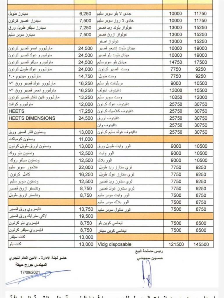 أصدرت إدارة حصر التبغ والتنباك اللبنانية، لائحة بأسعار مبيع كل السجائر والمعسّل، وشهدت انخفاضاً طفيفاً شمل مختلف الأصناف، وهي الشكل الآتي: