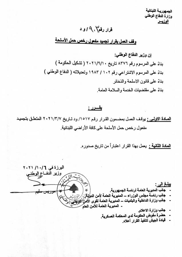 قرَّر وزير الدفاع الوطني موريس سليم، وقف العمل بمضمون القرار رقم 1517/ود تاريخ 7/3/2021 المُتعلق بتجميد مفعول رخص حمل الأسلحة على كافة الأراضي اللبنانية.