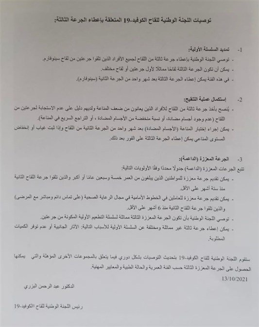 صدرت توصيات جديدة عن اللجنة الوطنية للقاح كورونا والمتعلقة بإعطاء الجرعة الثالثة.