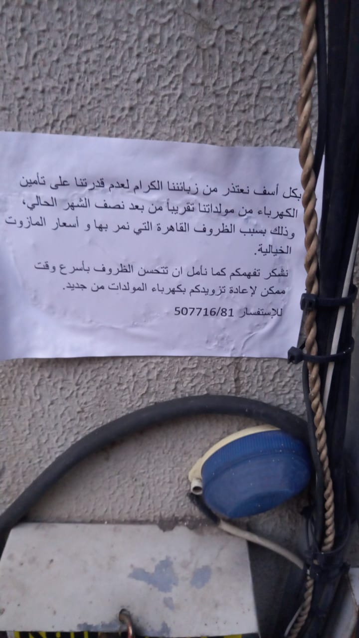 وجاء في الصورة: “بكلّ أسف، نعتذر من زبائننا الكرام لعدم قدرتنا على تأمين الكهرباء من مولداتنا تقريباً من بعد نصف الشهر الحالي، وذلك بسبب الظروف القاهرة التي نمرّ بها وأسعار المازوت.