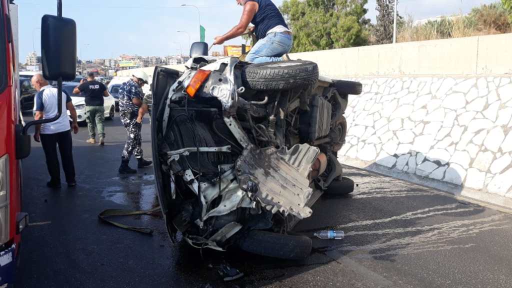 بالصور جريح نتيجة انقلاب فان على أوتوستراد ‎الجية باتجاه ‎صيدا وحركة المرور كثيفة في المحلة