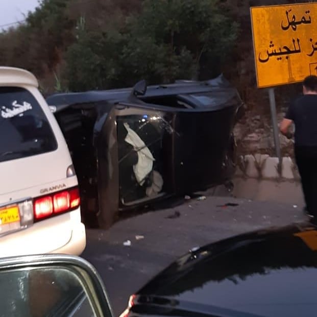 بالصور حادث سير مروع على حاجز المدفون مركبتين تجتاحان الحاجز بسرعة هائلة ومن ثم إنقلبتا على مسربي الحاجز والسير شبه متوقف باتجاه بيروت