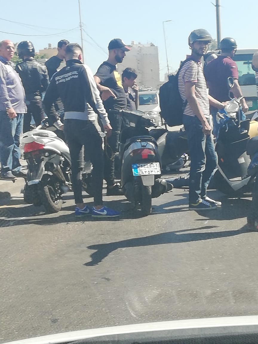 بالصورة حادث دراجة وسيارة طريق الطيونة باتجاه المطار