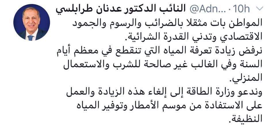 الدكتور النائب عدنان طرابلسي: المواطن بات مثقلا بالضرائب والرسوم والجمود الاقتصادي وتدني القدرة الشرائية.