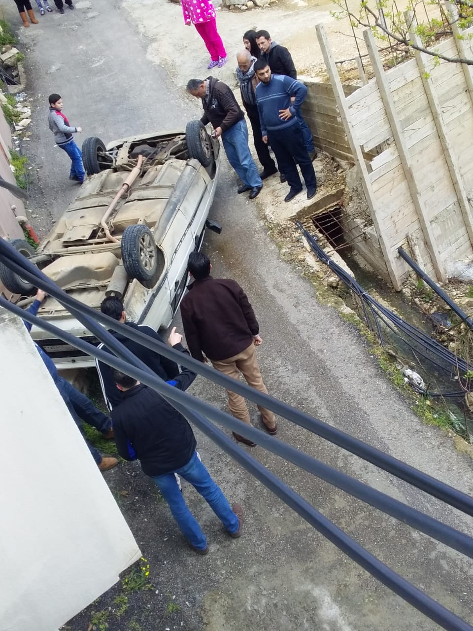 انقلاب سيارة في منطقة حقل العزيمة-الضنية واقتصرت الاضرار على الماديات