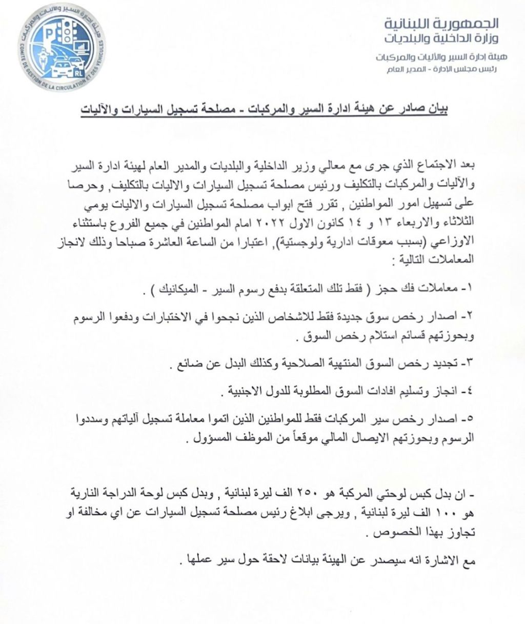 هيئة إدارة السير: فتح أبواب مصلحة تسجيل السيارات الثلاثاء والأربعاء في جميع الفروع باستثناء الأوزاعي