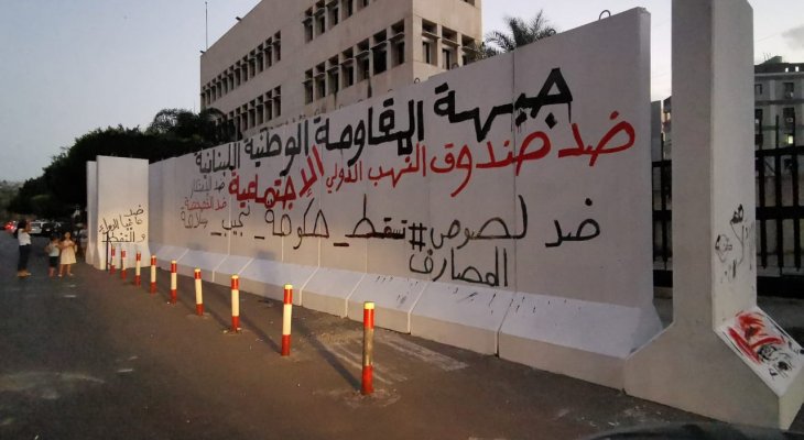 كتابة شعارات ضد مصرف لبنان على البلوكات الاسمنتية امام فرع صيدا